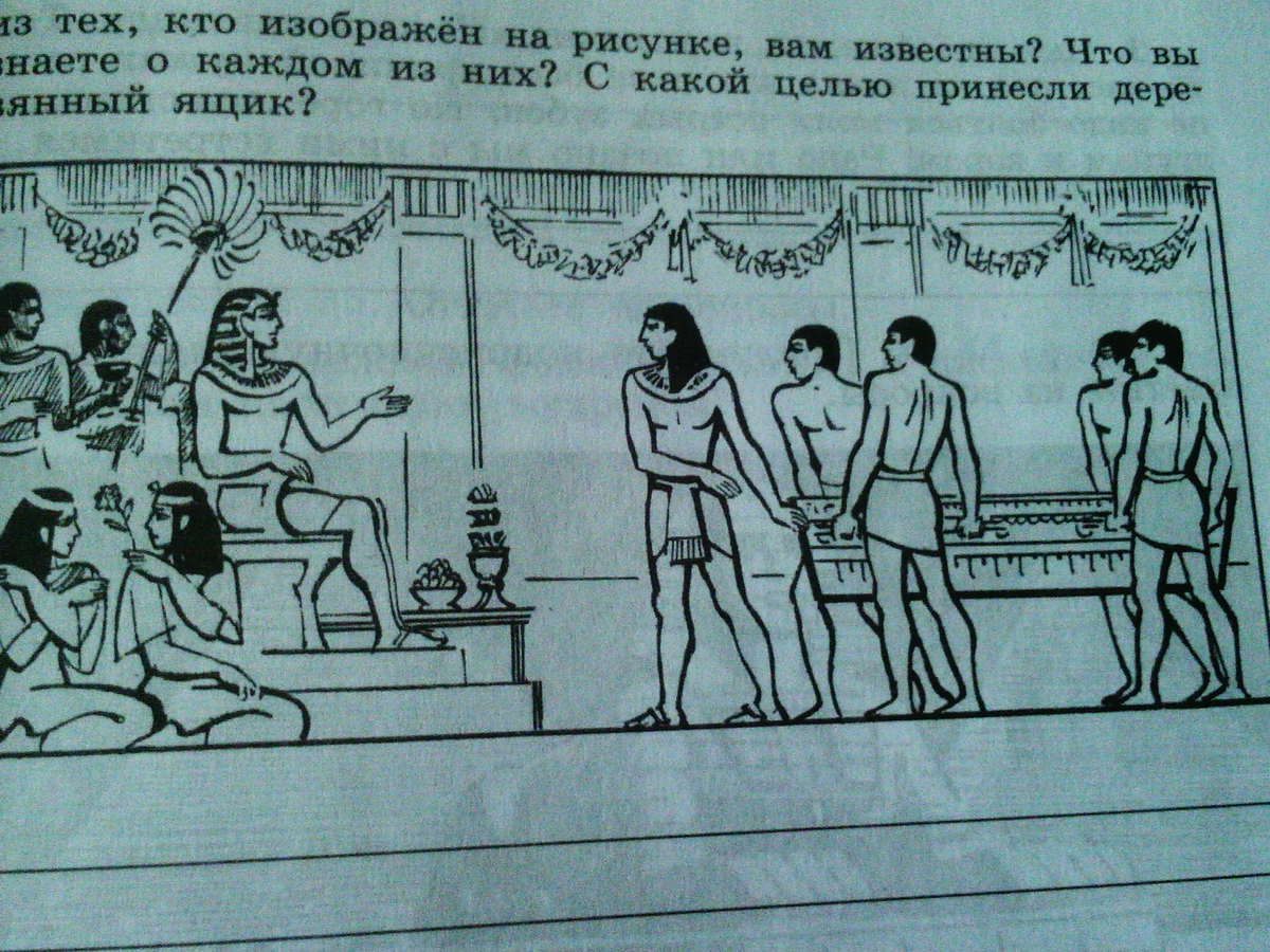 нам рисунке скорее всего изображён бал на котором Сет собирался убить Осириса. Деревянный ящик-гроб.Его принесли что бы посмотреть в пору ли он Осирису (его готовили под него) вскоре он оказался как раз и слуги бога песчаных бурь отнесли гроб в Нил и выкинули его там.