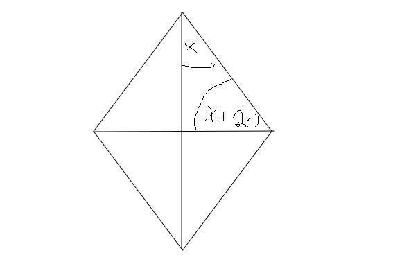 Один из углов, которые образует сторона ромба с его диагоналями, больше другого на 20º.Найти углы ромба.