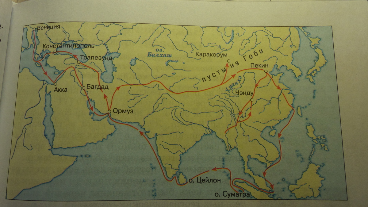 Сначала они морем путешествовали по Анатолии, то есть до полуострова Малая Азия (ныне в Турции). Затем по суше, преодолевая перевалы, прошли через Армянское нагорье, пересекли Месопотамию, Иранское нагорье, горную страну Памир, принадлежащую сегодня Таджикистану. Пройдя через пустыни Западного и Восточного Туркестана (ныне – Синьцзян), путешественники – после трех с половиной лет пути! — добрались наконец до дворца великого хана. В то время, когда Марко Поло странствовал по Азии.