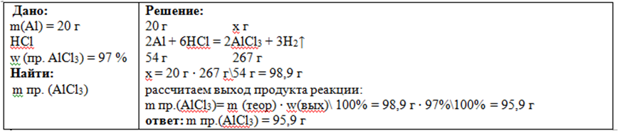 Определите массу соли, которую получили при взаимодействии 20 г. алюминия с соляной кислотой, если практический выход соли составляет 97%