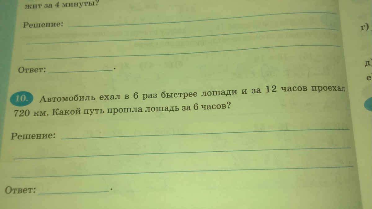 Автомобиль ехал в 6 раз быстрее лошади и за 12 часов проехал 720 км. Какой путь прошла лошадь за 6 часов