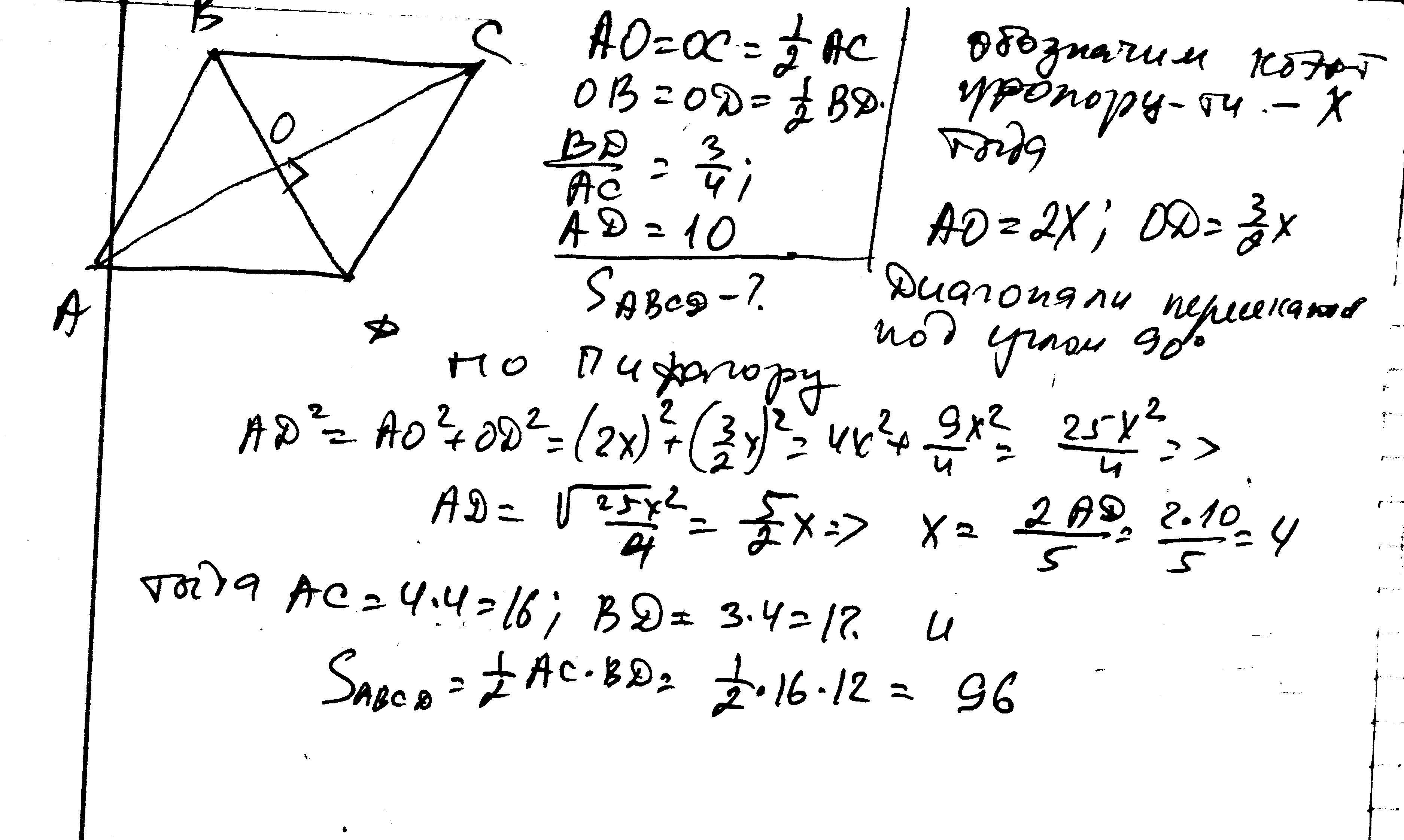 Найти площадь ромба ,если его сторона =10,а диагонали относятся как 3:4 Пожалуйста!!!Буду очень благодарна
