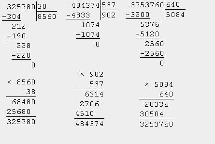 выполни деления и сделай проверку умножением 1) 325 280 / 38 , 2) 484 374 / 537 , 3) 3253760 / 640 помогите пож