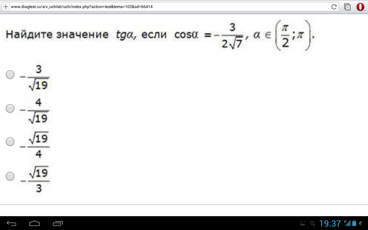 Найдите значения tg альфа, если cos альфа=- относится ко всей дроби 3/2корня из 7, альфа принадлежит(п/2;п) . Задача и варианты ответа на картинке