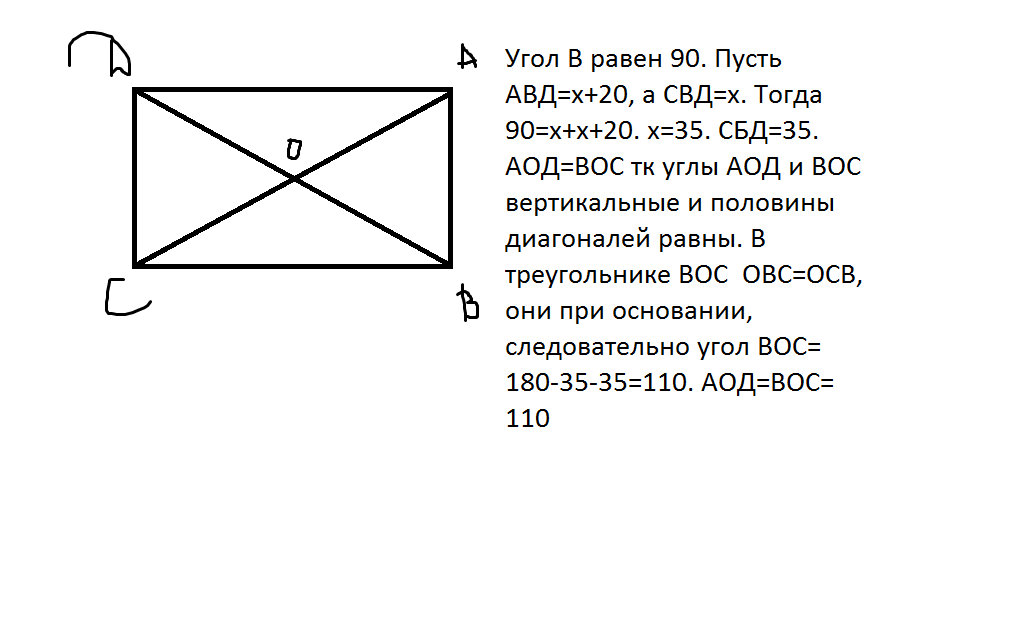 дано АВСД прямоугольник, точка О- точка пересечения его диагоналей. угол АВД больше угла СВД на 20 градусов. найти углы треугольника АОД.