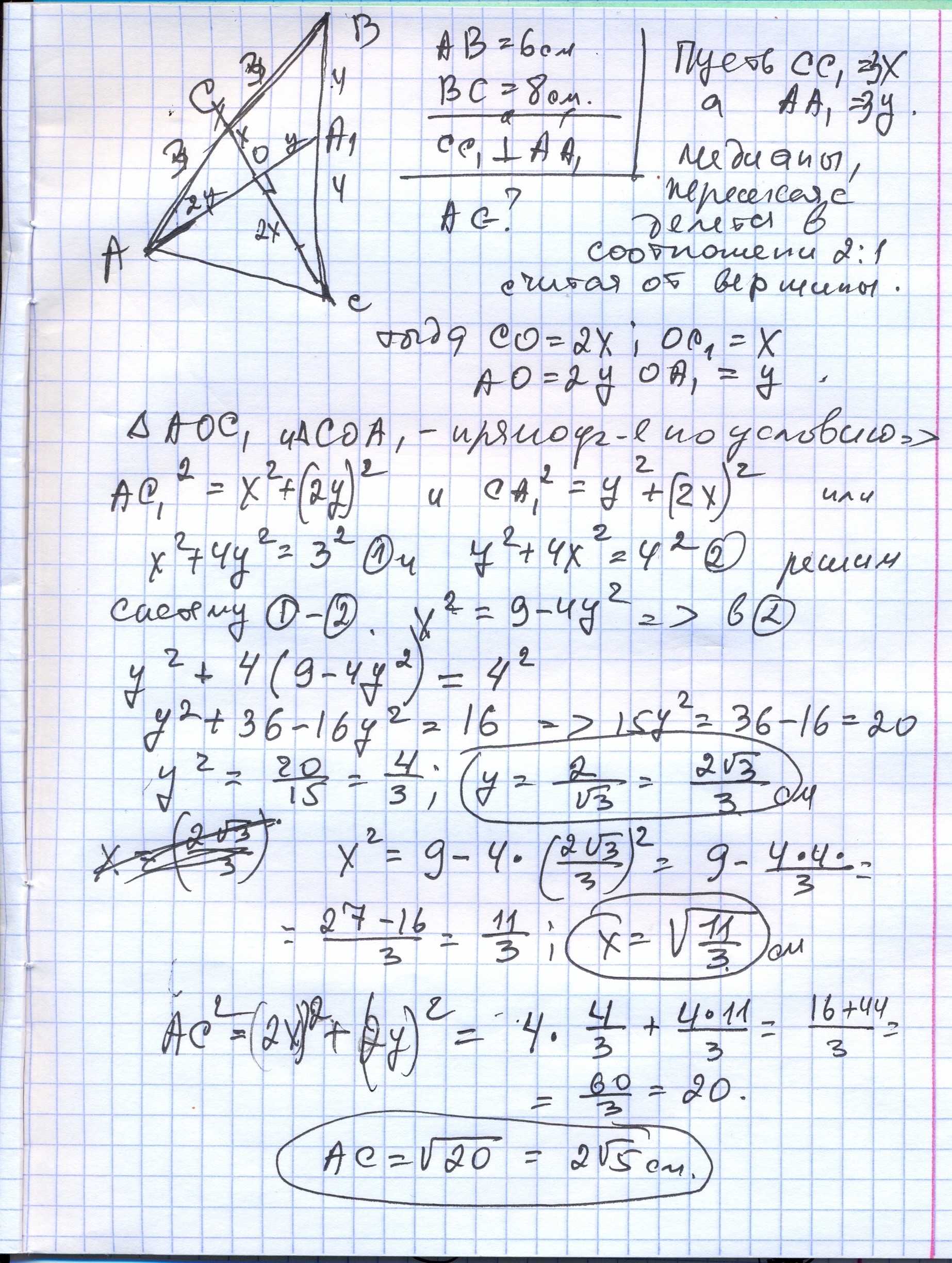 Длины двух сторон треугольника равны 6 и 8,медианы, проведенные к этим сторонам взаимно перпендикулярны.Найти длину 3 стороны.