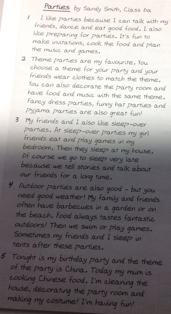 1. Я люблю вечеринки потому,что я могу поговорить со своими друзьями,потанцевать и покушать хорошей еды. Я также люблю готовится к вечеринкам. Это весело: делать приглашения,готовить еду,планировать музыку и игры.