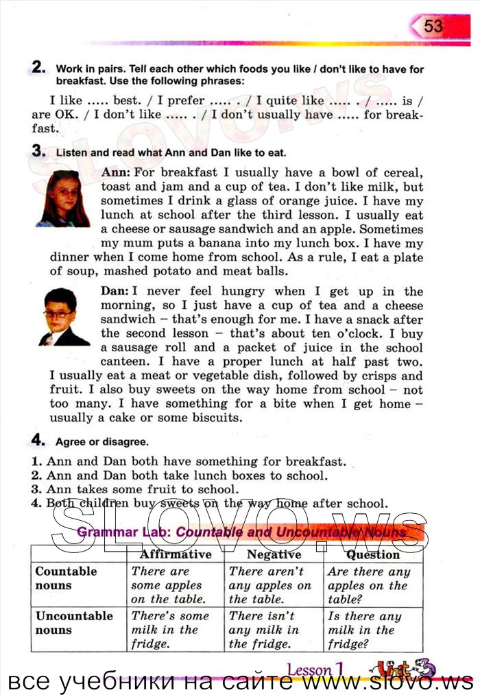 Енн: На сніданок у мене зазвичай є миску вівсяних пластівців, тосту і джему і чашкою чаю. Я не люблю молоко, але іноді я випити склянку апельсинового соку. У мене є свій обід у школі після третього уроку. Я зазвичай їм бутерброд з сиром чи ковбасою і яблуко. Іноді моя мама ставить банан в мою коробку для сніданку. У мене є свій вечерю, коли я прийшов додому зі школи. Як правило, я з'їсти тарілку супу, картопляного пюре і м'ясні кульки. Ден: Я ніколи не відчувати себе голодним, коли я встаю вранці, так що я просто випити чашечку чаю і бутерброд з сиром - це достатньо для мене. Я перекусити після другого лимона - ось про 10:00. Я купити рулон ковбаси і пачку соку в шкільній їдальні. У мене є належне обід в половині шкідника два. Я зазвичай їм м'яса або овочеве блюдо, а потім чіпсів і фруктів. Я також купити солодощі на шляху додому зі школи - не надто багато. У мене для укусу, коли я повертаюся додому -Зазвичай торт або печиво.