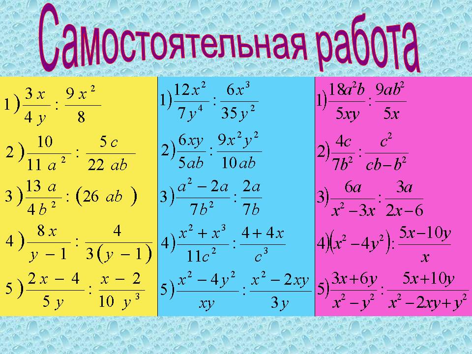 5) ((2x-4)/5y):((x-2)/10y^3) = ((2x-4)/5y)*(10y^3/(x-2)) = (2*(x-2) *10y^3)/ (5y*(x-2)) = 4y^2