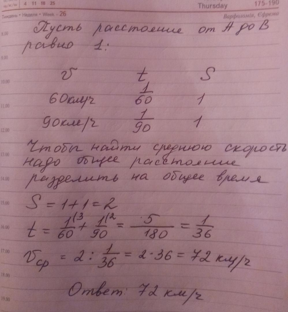 Из пункта А в пункт Б ехал автобус со скоростью 90 кмч, на обратном пути он снизил скорость до 60 кмч. Какова средняя скорость автобуса на всем пути следования?