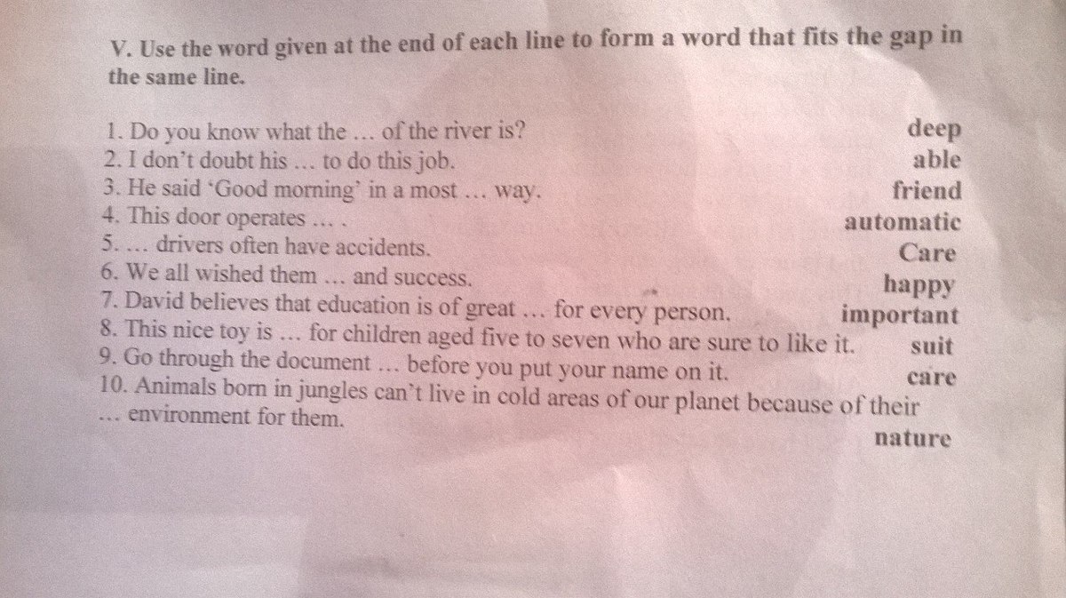 1. Depth; 2. Не поняла; 3. Friendly; 4.automatically; 5.Careless; 6. Happiness; 7. Importance; 8. Suitable; 9. Careful; 10. Naturally.
