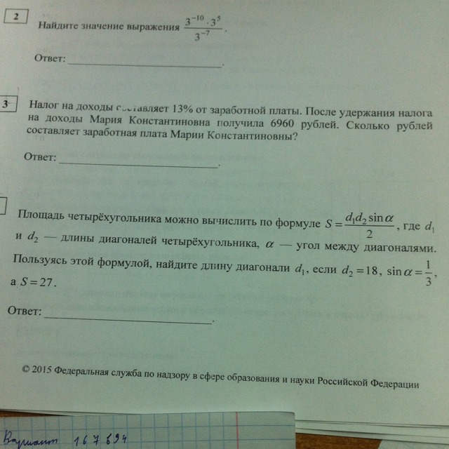 2.;frac{3^{-10}cdot3^5}{3^{-7}}=frac{3^7cdot3^5}{3^{10}}=3^{7+5-10}=3^2=9\\3.;100%-13%=87%\6960;=;87%\x;=;100%\x=frac{6960cdot100}{87}=8000\\4.;S=frac{d_1d_2sinalpha}2\d_1=frac{2S}{d_2sinalpha}=frac{2cdot27}{18cdotfrac13}=frac{54}6=9