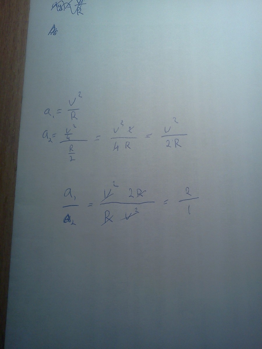 Шарик движется по окружности радиусом r со скоростью v. Как изменится центростремительное ускорение, если скорость уменьшить в 2 раза,и радиус окружности уменьшить в два раза?