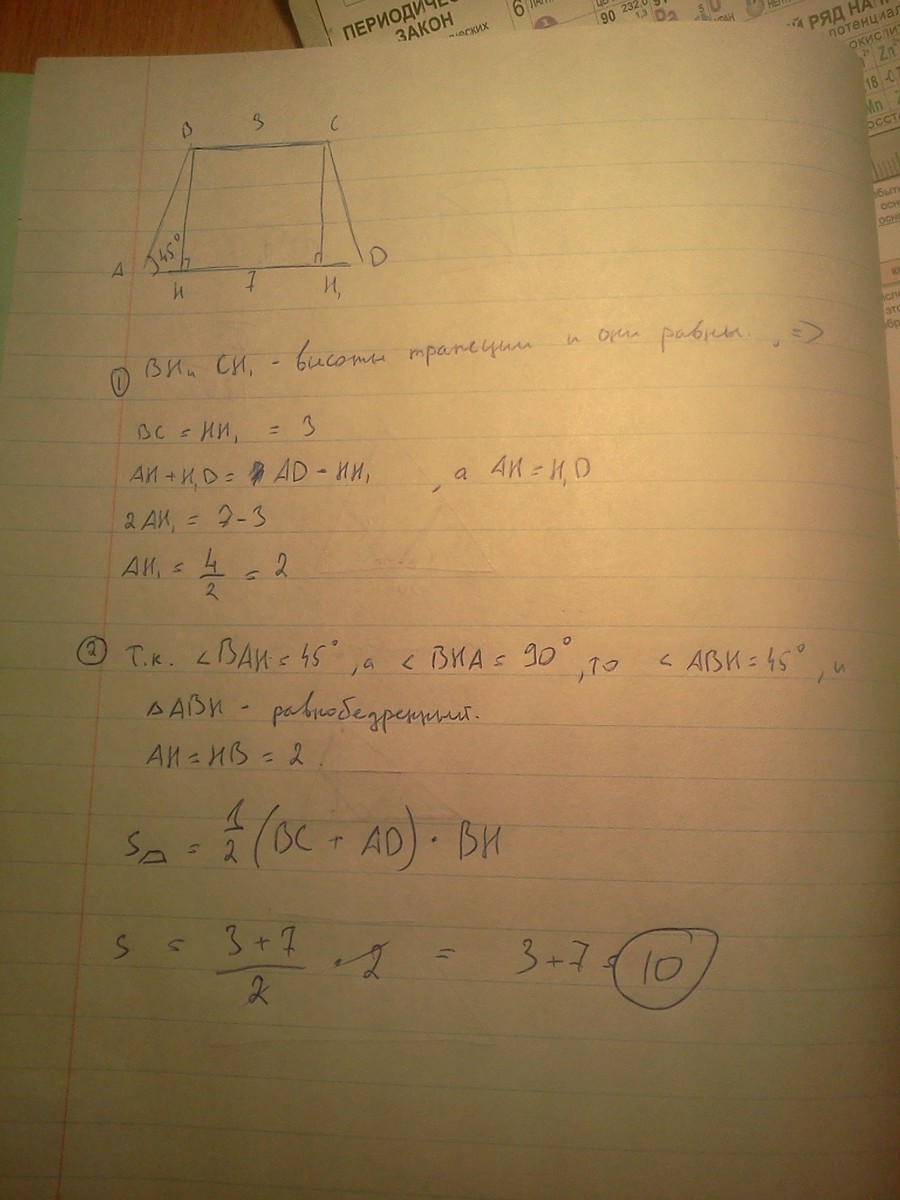 т.к она равнобедренная то нижние углы по 45, верхнии по 135, провоедем высоту, посмотрим в ней углы т. к. один 45, другой прямой то есть 90, => ещё один 45, значит этот маленький треуг. равноб. считаем, нижнее основание 7, проведем 2 высоту, 7-3=4 и делим на 2, а так как маленькие треуг. равноб. значит высота тоже два, находим площать (3+7)/2*2=10