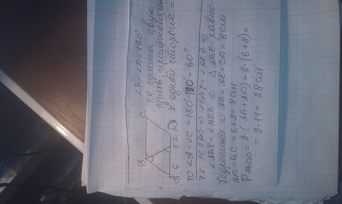 1) в параллелогрмаме ABCD угол B=120° и биссектриса острого угла делит сторону AD на отрезки AE=6см и DE=2см