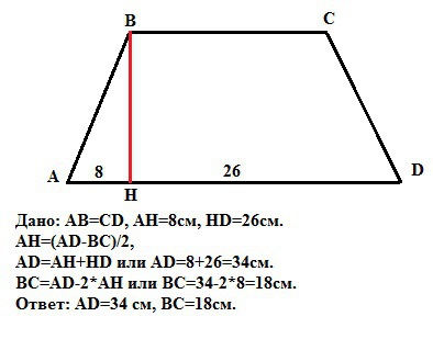 Высота, опущенная из вершины тупого угла равнобедренной трапеции, делит ее большее основание на два отрезка, длины которых равны 8см и 26см. Вычислите длины оснований данной трамеции.