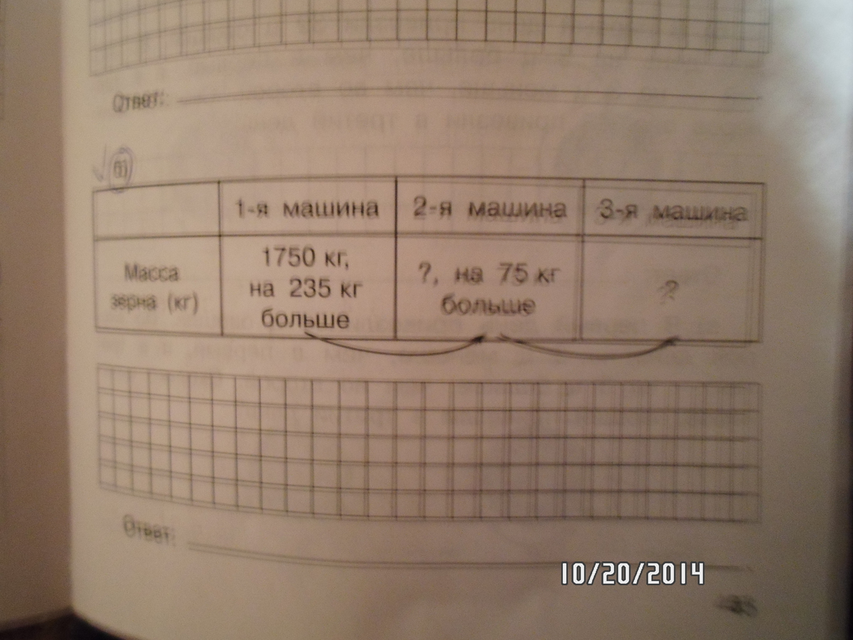 1-я машина было зерна 1750 кг на 235 кг больше чем на второй , на второй машине на 75 кг больше зерна чем на третий .Сколько было зерна на третий машине ?