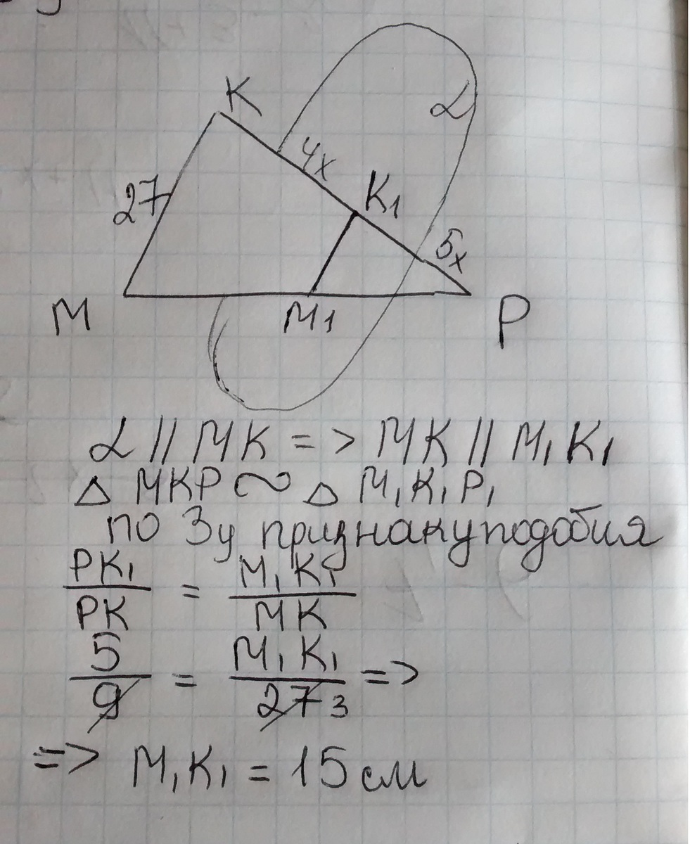 Дан треугольник MPK. Плоскость ,параллельная прямой MK , пересекает сторону MP в точке M1, а сторону PK-в точке K1. Вычислите длину отрезка M1K1, если MK=27 см, PK1:K1K=5:4