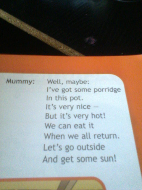 а вот сам текст: Well, maybe: I've got some porridge In this pot It's very nice - but it's very hot! We can eat it when we all return. Let's go outside and get some sun! это перевод: Ну, может быть: у меня есть каши В этом горшке Это очень приятно - но это очень жарко! Мы можем съесть его, когда все мы вернемся. Давайте выходить на улицу и получить некоторое солнце!