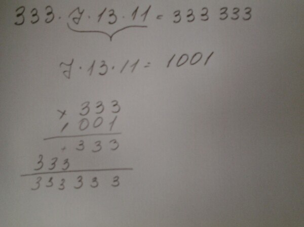 от перемены мест слогаемых сумма не меняется значит из примера 333*7*13*11 мы можем получить пример 333*1001. подвох виден при решении в столбик, все из за двух 0 посередине числа 1001. мы можем проделать тот же фокус с 4х значным числом, например 4444 если будим умножать на 10001.