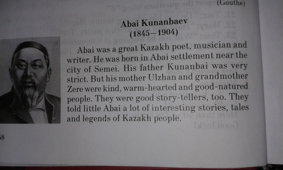 Абай был великим Казахским поэтом, музыкантом и писателем. Он родился в поселении около города Семеи. Его отец Кунанбай был очень строгим. Но его мама Ульжан и бабушка Зере были добрыми, сердечными и добродушными людьми. Так же они были хорошими сказительницами историй. Они рассказывали маленькому Абаю много интересных историй, сказок и легенд о Казахских людях. Абай в возрасте 9 лет пошёл в религиозную школу. Но когда ему исполнилось 13 лет, он начал изучать русский язык и пошёл в русскую школу в Семеи. Ему нравилось читать книги о великих русских поэтов и писателей.: Пушкине, Лермонтове, Крылове. Позже Абай переводил их работы на Казахский и написал много литературных шедевров. Его поэзия популярна и сейчас. Слова Абая были переведены на многие забытые языки. Абай Кунанбаев умер в 1904 году. Казахские люди гордятся этим великим поэтом. Он хорошо известен и во всём мире.