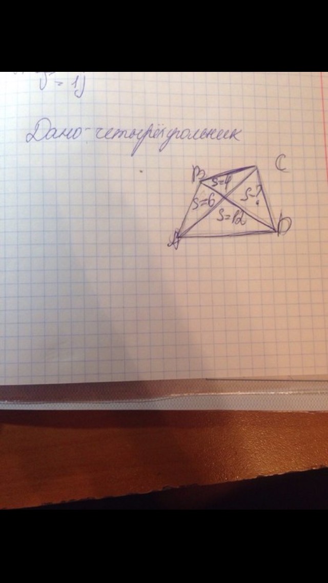 Четырёхугольник разделен диагоналями на 4 треугольника. Площади трех известны. Как найти площадь четвертого треугольника?