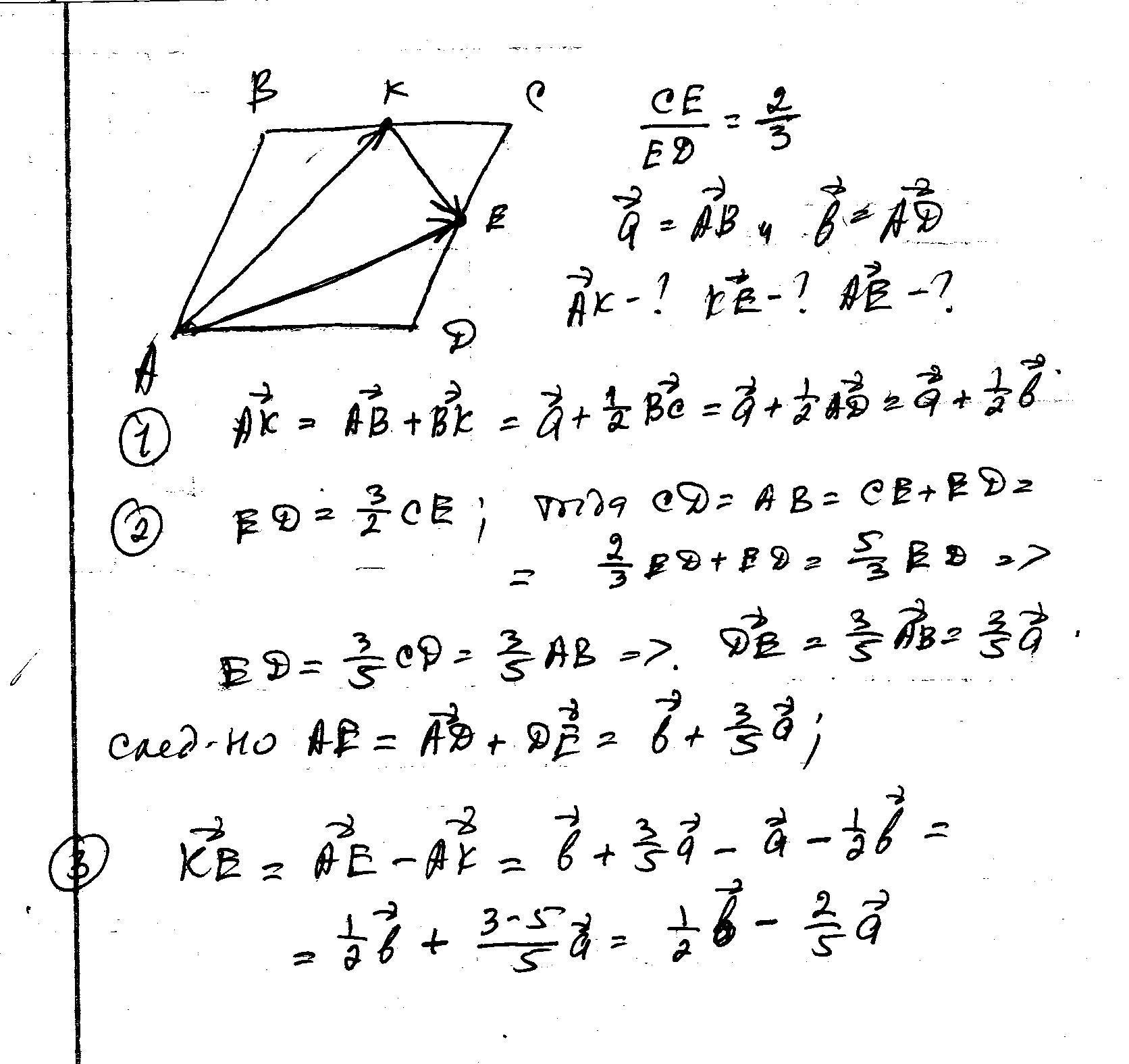 На сторонах BC и CD параллелограмма ABCD отмечены точки K и E так, что BK=KC,CE:ED=2:3.Выразите векторы AK, AE, KE через вектор a= вектору AB и вектор b= вектору AD.