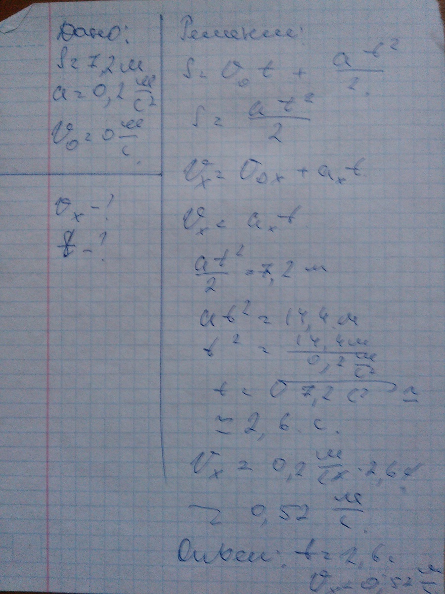Тело двигаясь из состояния покоя,проходит путь 7,2 м. с ускорением 0,2м/с^2.Определить время движения и конечную скорость.