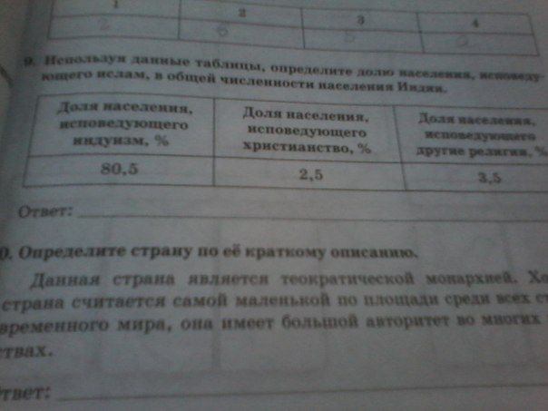 5.Используя данные таблицы,определите долю населения,исповедующего ислам, в общей численности населения Индии.