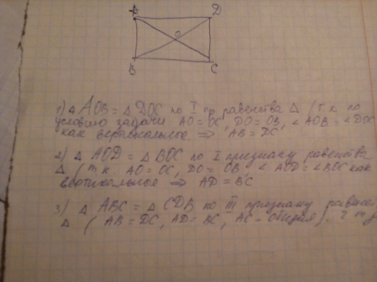 Отрезки АС и ВС точкой пересечения делятся пополам. Докажите, что треугольник АВС = треугольнику СDA