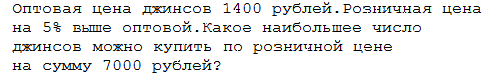 3) Теперь вычислим, какое наибольшее количество джинсов можно купить по розничной цене на сумму 7000 рублей. Для этого разделим 7000 на 1470.