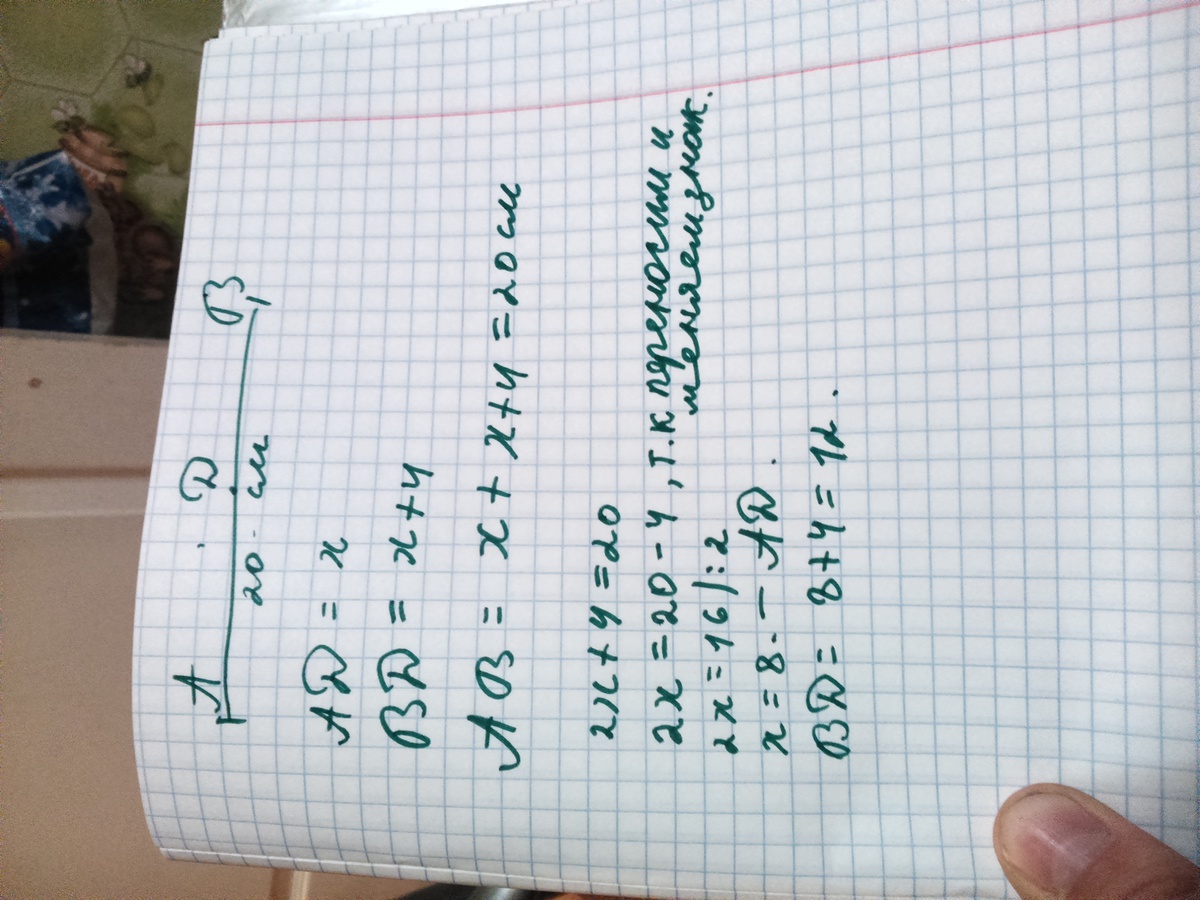 На отрезке АВ длиной 20 см отмечена точка D. Найдите длины отрезков AD и BD , если отрезок BD на 4 см длинyее отрезка AD.