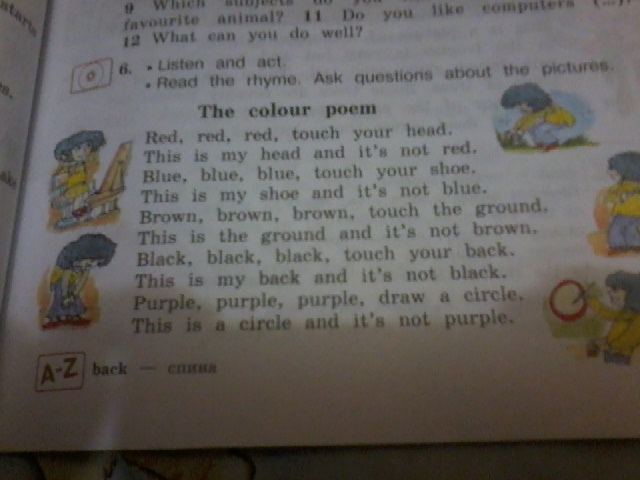 Цвет стихотворение Красный, красный. красный. коснуться головой Это моя голова, и это не красный. Синий, голубой, синий, коснуться вашего обуви. Это мой ботинок, и это не синий. Коричневый, коричневый. коричневый, коснуться земли. Это земля, и это не коричневый. Черный, черный, черный, прикоснуться спиной. Это мой вернулся, и это не черный. Фиолетовый, пурпурный, фиолетовый. нарисовать круг. Это круг, и не фиолетовый.