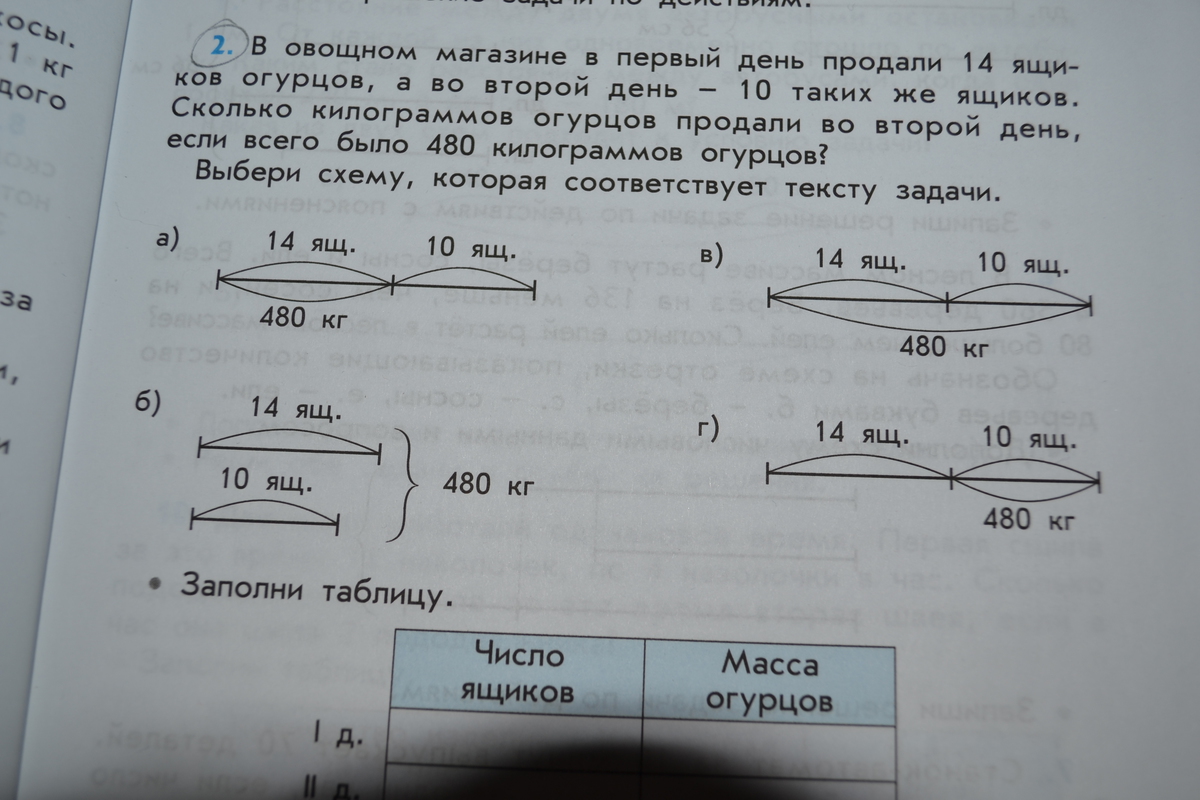 В овощном магазине в первый день продали 14 ящиков огурцов, а во второй день-10 таких же ящиков. Сколько килограммов продали во второй день, если всего было 480 килограммов огурцов?