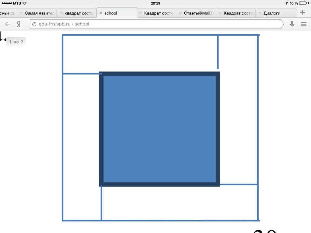 Квадрат состоит из одного внутреннего квадрата (чёрного) и четырех равных белых прямоугольников (см. рис. 1). Периметр каждого прямоугольника равен 40 см. Найдите площадь чёрного кв