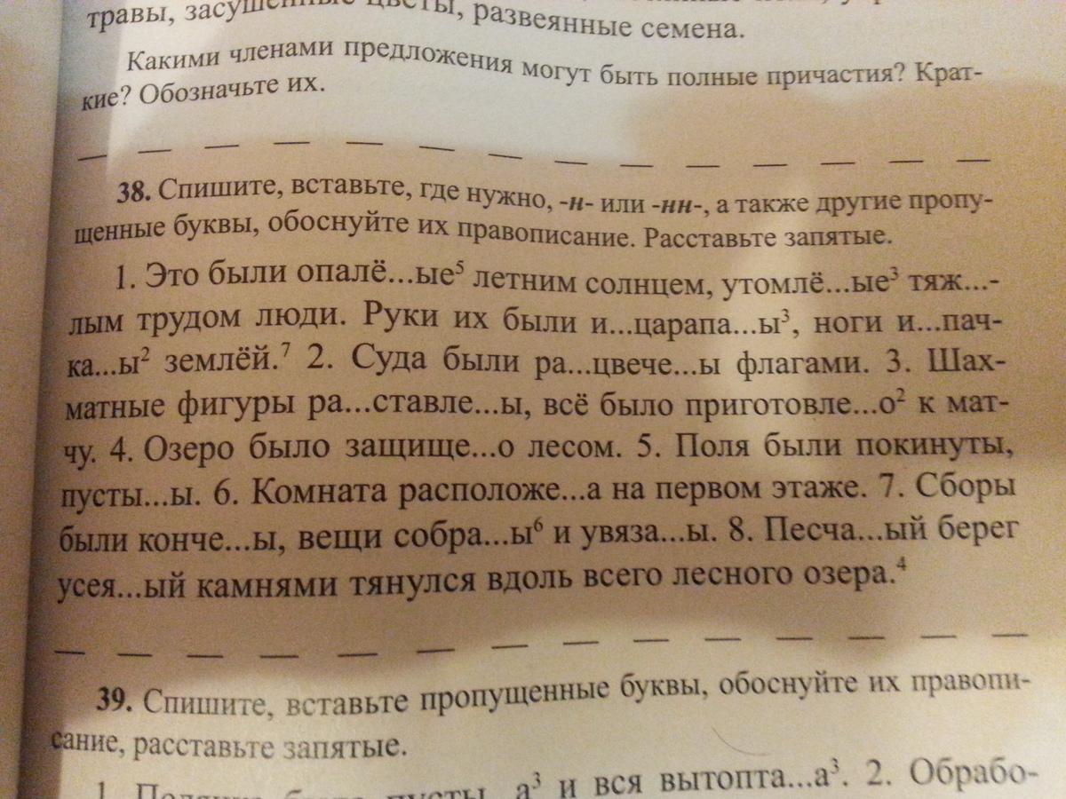 опалённые,утомлённые,тяжёлые,исцарапаны,испачканы,расцвечены,расставлены,приготовлено,защищено,пустынны,расположена,кончены,собраны,увязаны.Песчаный берег,усеянный камнями,тянулся ....