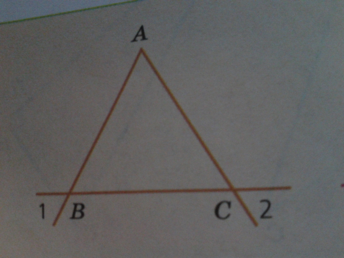 углы 1 и 2 на рисунке равны(равнобедненный треугольник АВС) Сравните отрезки АВ и ВС