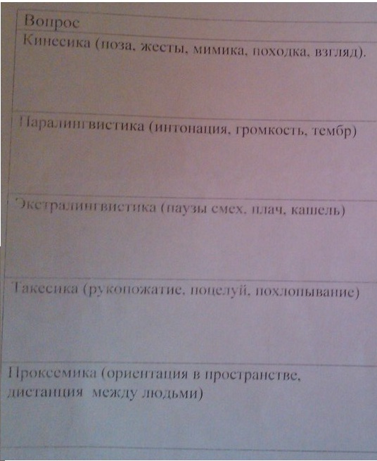 Кинесика (в переводе с греческого — движение)-это наука о языке тела и его частей. Сюда относится мимика, интонация, жестикуляция. Это очень помогает в в человеческом общении. Ведь сказанное слово, но с разной интонацией=мы и воспринимаем по-разному...А мимика помогает скрасить выражение. Но и существет вероятность неверного истолкования того или иного жеста, той или иной позы. При помощи мимики, интонации мы можем понять отношение собеседника к обсуждаемому вопросу, его настрой, его состояние (радостное или агрессивное)