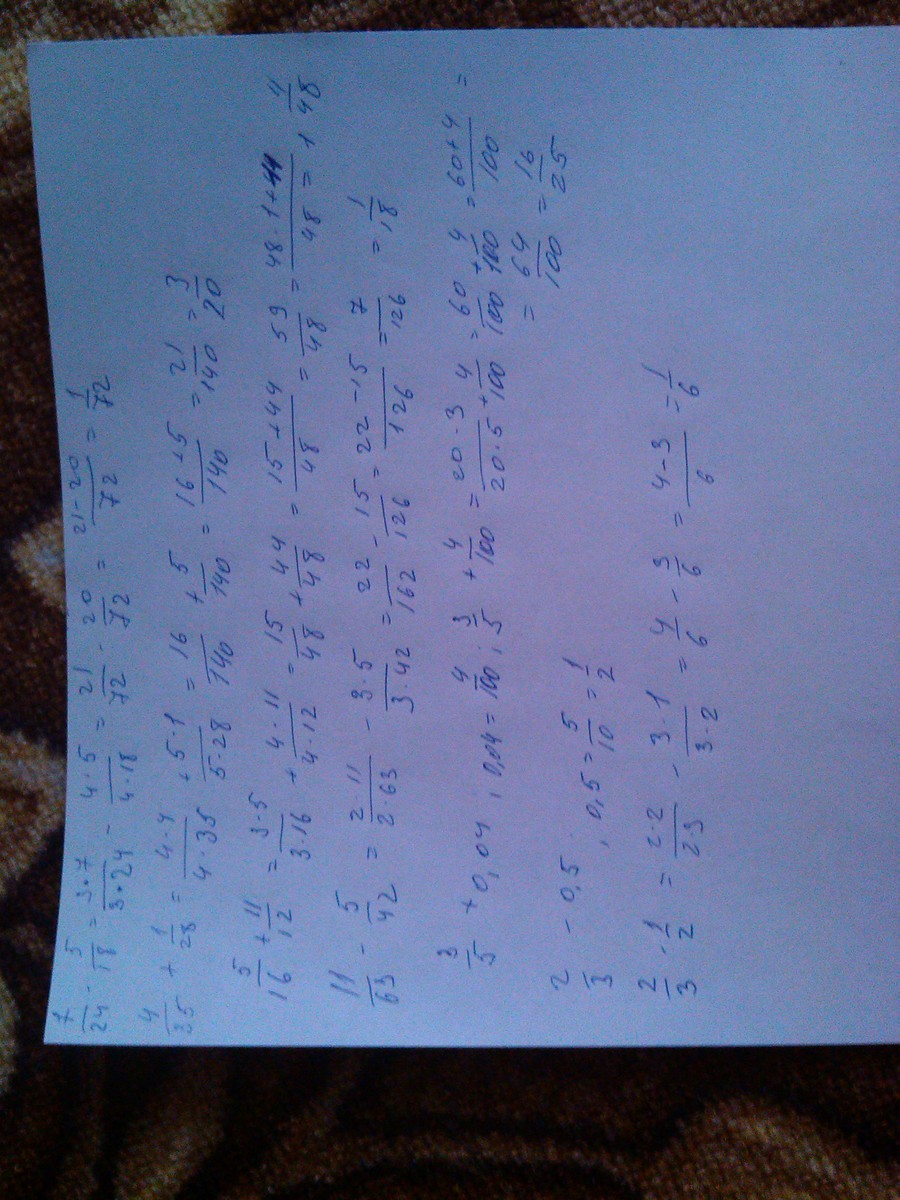 Выполните действие(обьяснение)7/24-5/18;4/35+1/28;5/16+11/12;11/63-5/42;3/5+0,04;2/3-0,5