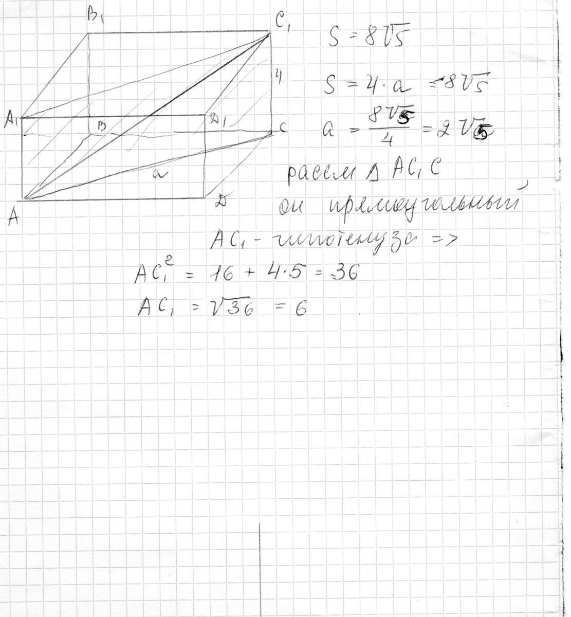 Площадь диагонального сечения , прямоугольного параллелепипеда равна 8 корней из 5 см в квадрате . а боковое ребро 4 см. Найдите длину диагонали параллелепипеда.