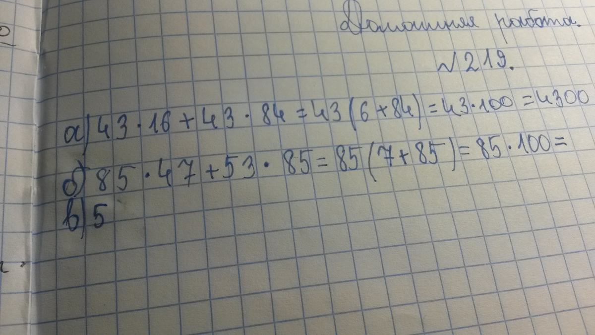 а) 43 * 16 + 43 * 84 = 43 * (16 + 84) = 43 * 100 = 4 300