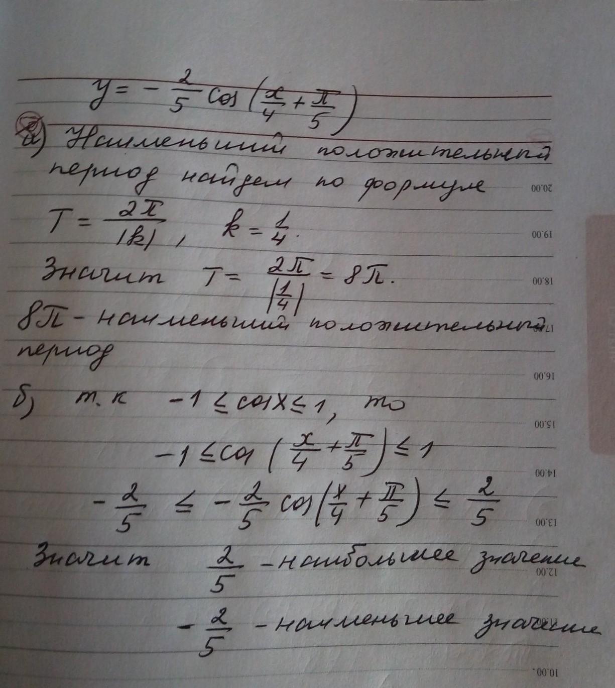 Для функции y=-2/5 cos (x/4+п/5) а)найти наименьший положительный период, б) наибольшее и наименьшее значение.
