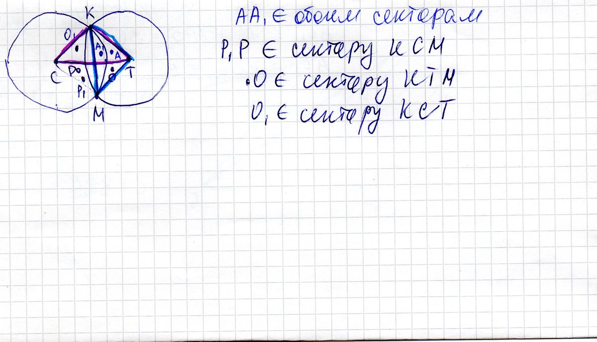 начертите две окружности с центрами С и Т так, чтобы они пересекались,Точки пересечения окружностей обозначте К и М, Постройте секторы КСТ и КТМ, Отметьте по две точки, которые принадлежат а) обоим секторам б)только сектору КСМ в) только сектору КТМ г) хотябы одному из секторов