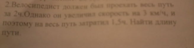 Велосипедист должен был проехать весь путь за 2 часа. Однако он увеличил скорость на 3 км/ч, и поэтому весь путь затратил 1,5 часа. Найти длину пути.