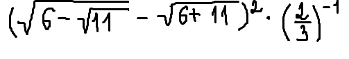 (sqrt{6- sqrt{11} }- sqrt{6+ sqrt{11} }) ^{2}cdot (frac{2}{3}) ^{-1}= \ =(6- sqrt{11} -2sqrt{6- sqrt{11}}cdot  sqrt{6+ sqrt{11} }+6+ sqrt{11}) cdot (frac{3}{2})= \ =(12-2sqrt{(6) ^{2} -(sqrt{11}) ^{2} })cdot   frac{3}{2}=  \ =