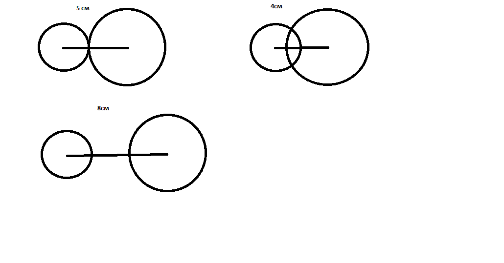 Радиус первой окружности равен 2см, а радиус второй окружности - 3 см. Расстояние между центрами этих окружностей равно: 1)5 см; 2) 4 см; 3) 8 см. Как расположены эти окружности относительно друг друга? Начертите их.