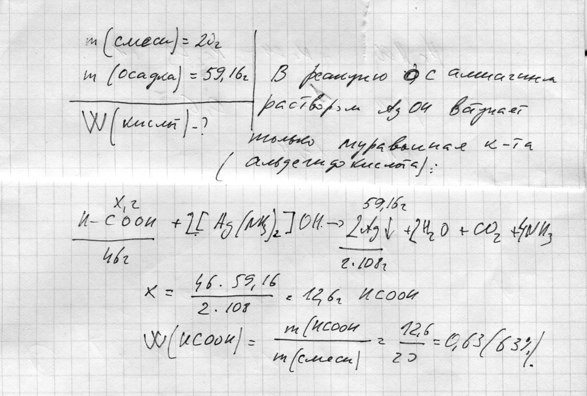 Смесь муравьиной и уксусной кислот массой 20 г обработали аммиачным раствором гидроксида серебра.Выпал осадок массой 59,16г.определите массовые доли