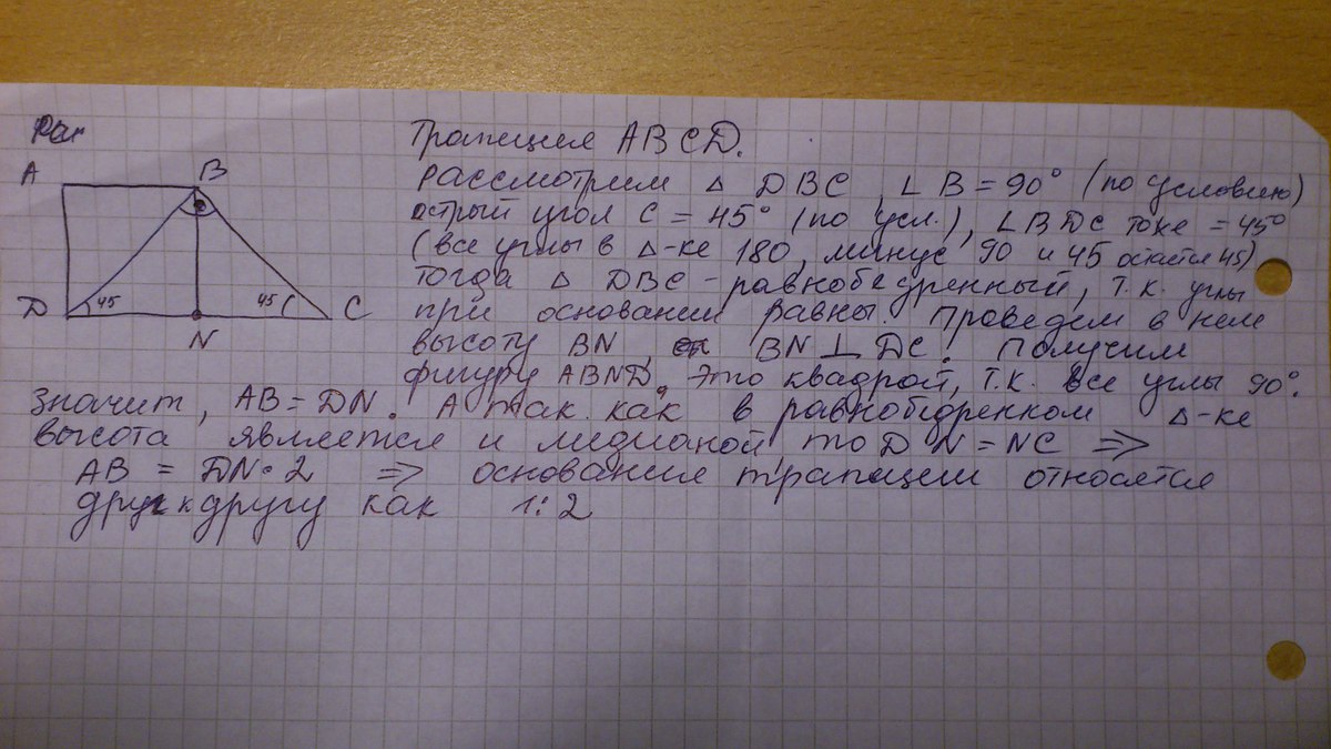 В прямоугольной трапеции диагональ перпендикулярна к боковой стороне,острый угол равен 45°. Найдите отношение оснований
