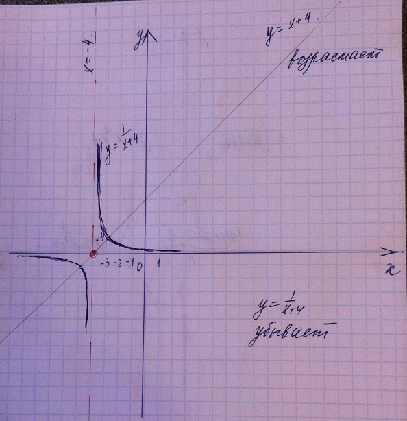 Там где прямая пересекает ось х, в точке х=-4, данная функция не существует. Имеет разрыв.