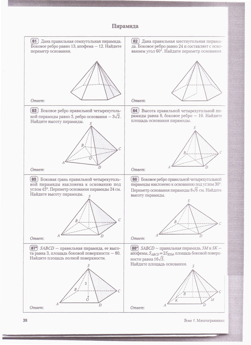 86. Сторона основания пирамиды =2 V6, Прямоуг. тр-к SOC против ула 30 гр.лежит высота,значит она равна 1/2бокового ребра. Тогда Высота=х,бок ребро=2х, катет ОС=2V3/ ( 2V3)^2=(2x)^2-x^2. 12=3x^2. 4=x^2 X=2